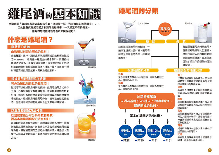 書中將雞尾酒分為九大種類、共120款雞尾酒,從經典款、南國熱帶風情、健康風潮,到作者設計的得獎作品都羅列其中,並提供飲用時機的建議,讀者可依自己的心情、聚會類型、季節來選擇。例如,舉辦家族聚會時,適合以香檳酒為基酒、華麗登場的皇家基爾雞尾酒最適合做為歡迎酒,冬季的夜晚,來杯熱奶油蘭姆,深色蘭姆酒的香氣充滿鼻腔,與融化奶油的濃厚香氣相混合,豐富多元的風味均衡,從身體溫暖到心底……