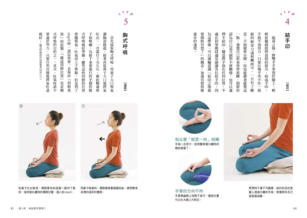 作者提出「專注、感知、放下」的三步驟,只要依循這三步驟逐步進行,就能收拾腦中雜念、趕走內心的負面能量,為身心注入滿滿活力。透過冥想,我們將學會以客觀且宏觀的態度去看待事物,視野寬廣了,心也會隨之開闊。