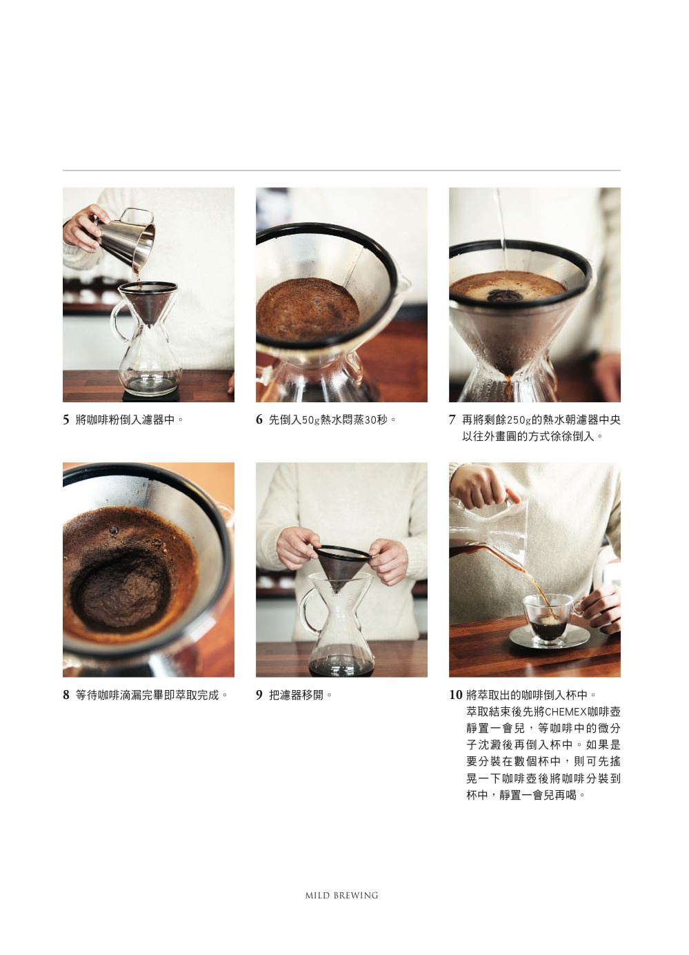 本書由韓國獲獎咖啡師都形秀親撰,前半部介紹沖煮咖啡前必須了解的基本知識、器具等說明;後半部則是介紹筆者使用各種器具實際的狀況,全書包含輕度、中度、重度、特殊沖煮方式,共有21種沖煮法,但願讀者能在其中找出自身愛好的咖啡滋味,歸納出自身的手沖咖啡祕訣!