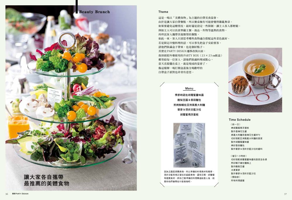 ——分別以「自助式」和「入座式」的宴會方式,介紹從西班牙小酒館風格、日式和風風格到適合各季節的10大派對主題,並提供實際辦趴時可能會遇到的困難以及貼心提醒⋯⋯只要確實掌握這些要點,相信每場聚會必定驚喜不斷、流連忘返。