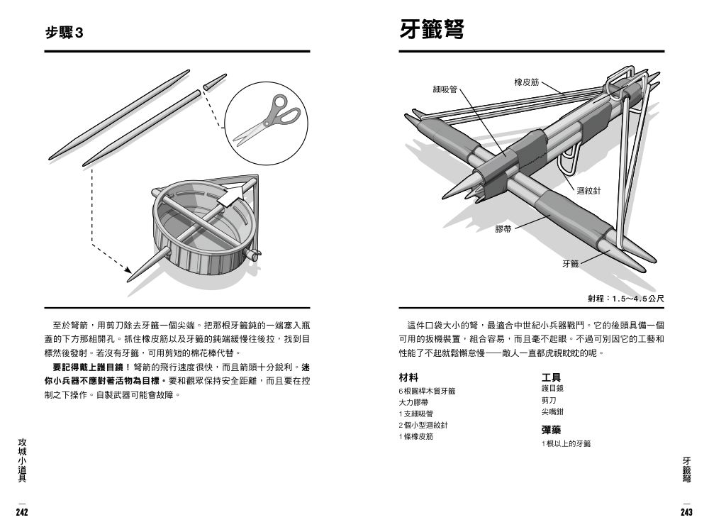 ◎每種武器原料都是由唾手可得的居家常備品,隨著作者的引導,就可以簡單做出將敵人打得唏哩花啦的小玩意。