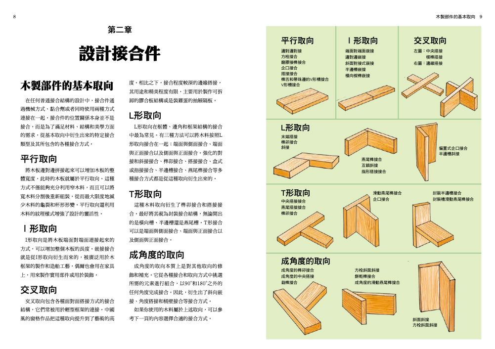 說明榫卯接合、燕尾榫接合、斜接接合等7大接合方式,以及50種變式。