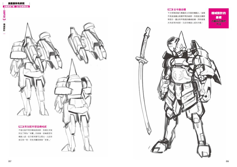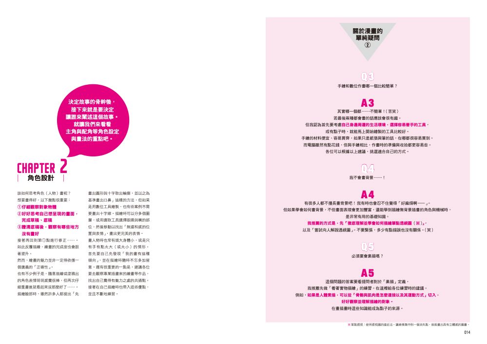 相較於抽象的文字解說、不連貫的範例舉證,書中將分七個章節,階段式循序說明【大綱構思】、【角色設計】、【機械設計】、【構圖與透視】、【分鏡稿】、【入墨線】與【上色+完稿】等繪製作業,具體演示嘗試錯誤的過程,帶領各位一窺漫畫家光鮮作品幕後的專業底蘊。