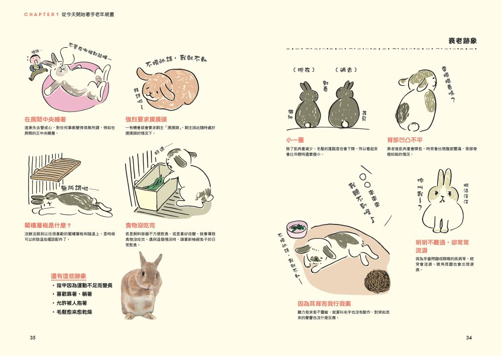 ◎從老年生活的基本規劃,到健康檢查、常見疾病的介紹等,收錄了家有中老年兔的飼主所需了解的詳盡資訊。