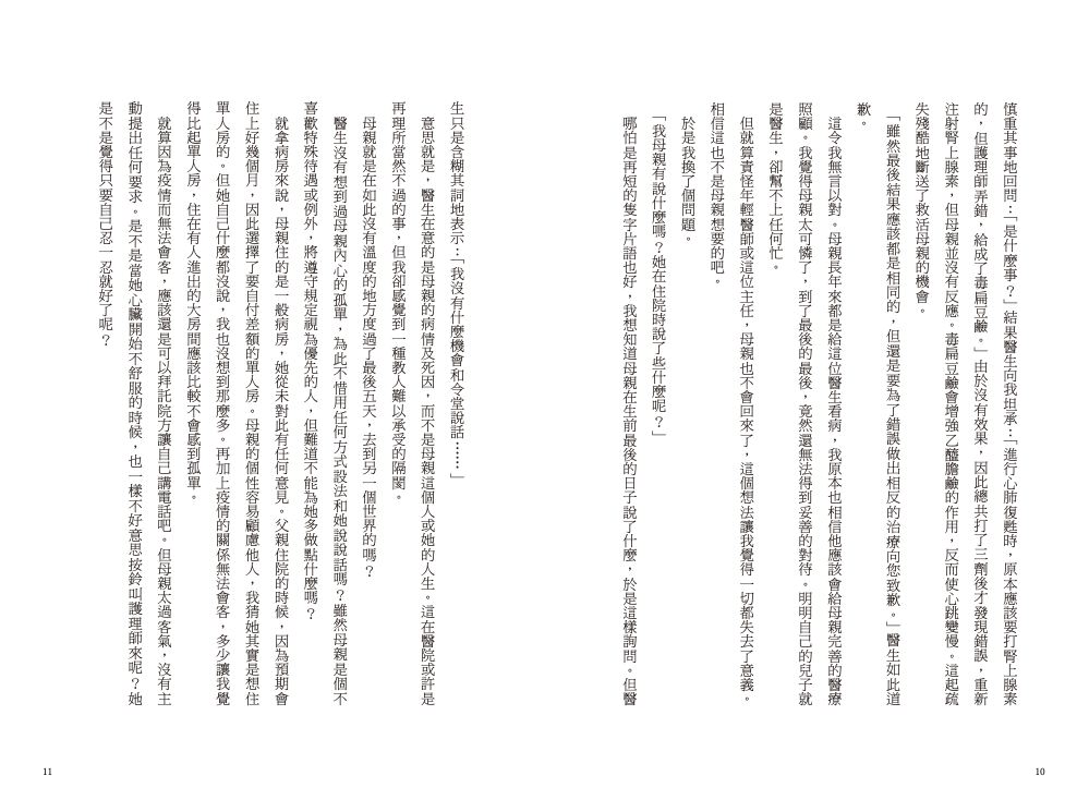 ◎作者的母親去世於醫院禁止會客的新冠疫情期間。在至親生前的最後時光,沒能陪伴左右,甚至來不及送至親最後一程,這是在疫情時代下的我們都極有可能遭遇的情況,相信能引起許多讀者的共鳴。