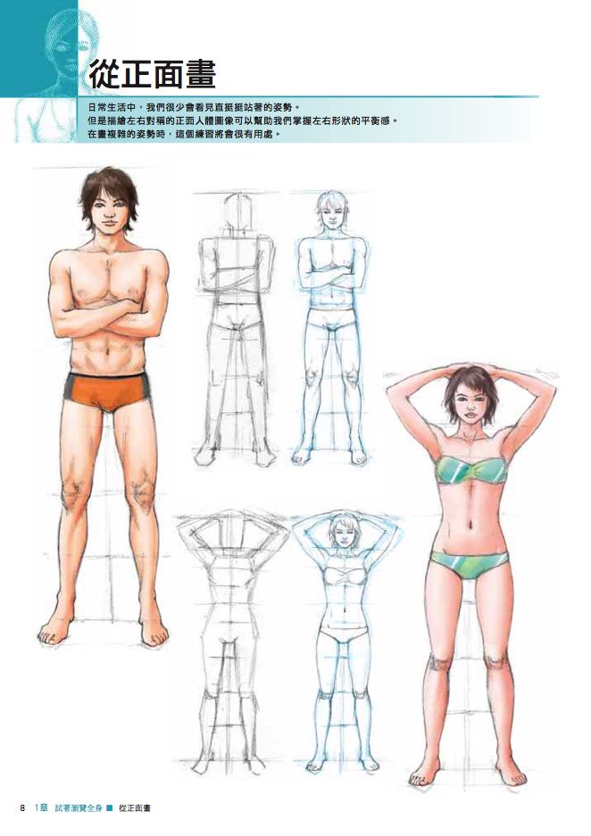 日常生活中,我們很少會看見直挺挺站著的姿勢。但是描繪左右對稱的正面人體圖像可以幫助我們掌握左右形狀的平衡感。在畫複雜的姿勢時,這個練習將會很有用處。