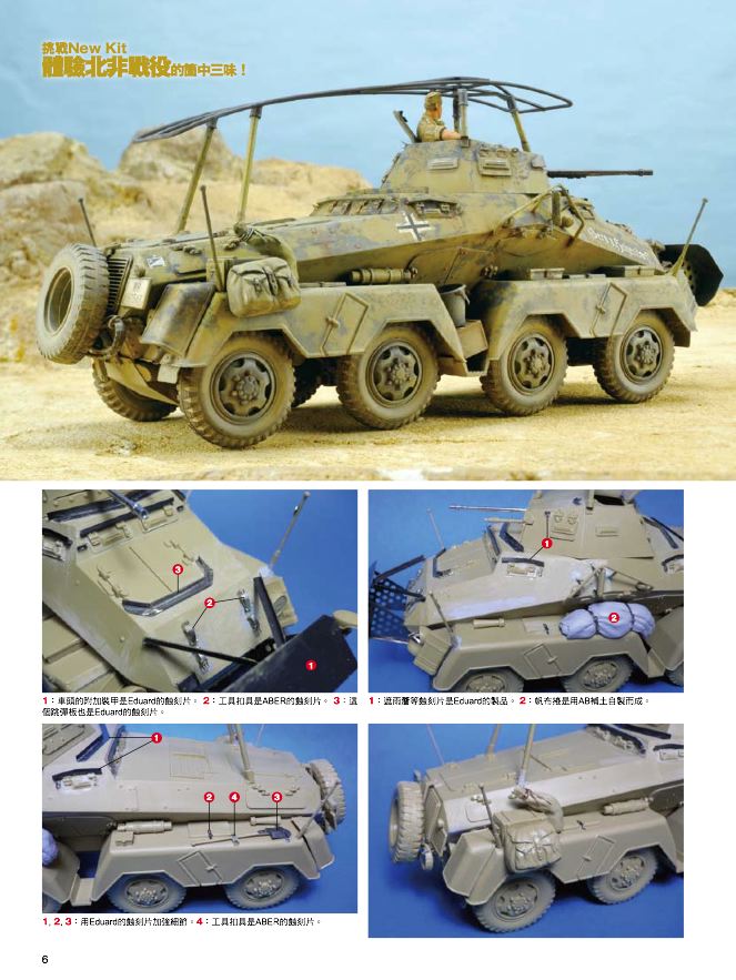 這盒套件源自於大家都很熟悉的田宮1/35 MM系列舊版No.36八輪重裝甲車,在追加車載裝備、新開模零件、蝕刻片零件、鋁製20mm KwK30機砲砲管及兩名非洲軍士兵之後,以新產品的面貌重新上市。雖然車體是來自MM系列草創初期的產品,但絲毫感覺不到老態,不愧是名廠田宮的優異產品。