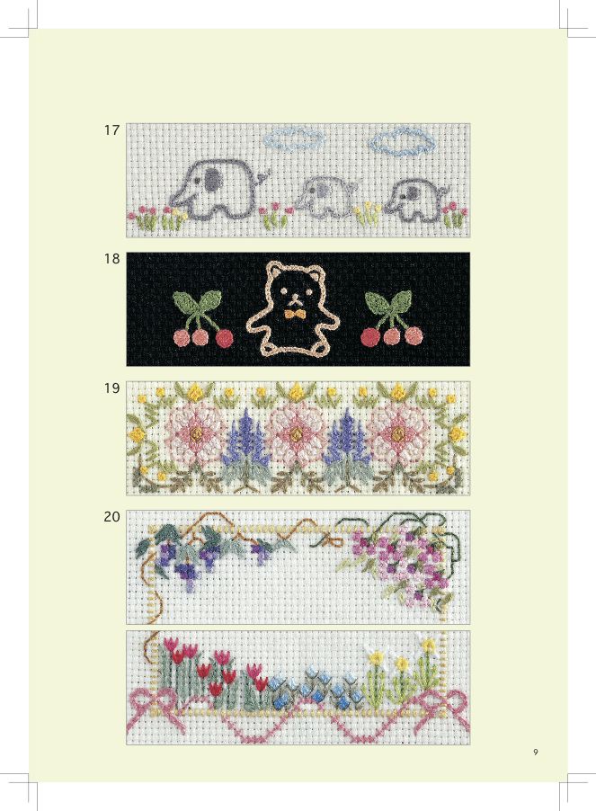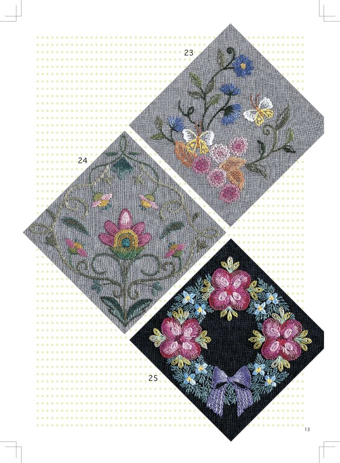 利用半成品縫製時,請先決定中央的位置,盡量從這裡開始往左右兩端刺繡。這樣比較能配合主體尺寸做補充或減少的調整。有些作品也可以在側面或背面接著刺繡連續花樣或是全面性的圖案等,也可以依照自己的喜好應用正面的圖案做簡單的刺繡,讓作品更有趣。拉線的力道要均等,不要太緊也不要太鬆。針目的大小要一致。有些半成品容易因刺繡而縐縮,請注意。刺繡的裡側盡量不要有很長的渡線,請一一固定好,或是以潛入或纏繞之前刺繡的方式渡線。日本的刺繡名師,著有多本相關書籍。
