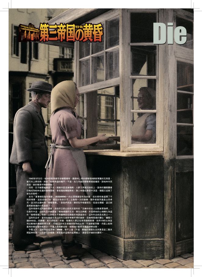 乍看之下,這件作品似乎和「軍事模型製作教範」搭不上邊,不過,戰後的德國生活其實是從二戰末期延伸而來,山田卓司的情景,就是處於這樣的延長線上,請各位仔細的欣賞吧。卷頭特集 第三帝國的黃昏