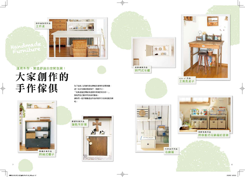 舉凡客廳、餐桌、廚房、小孩房、玄關等空間會用到的傢俱,都有詳盡的圖解說明,透過書中的傢俱樣式,還可一窺現在日雜風仿古、天然、以及鄉村風格所流行的樣式。